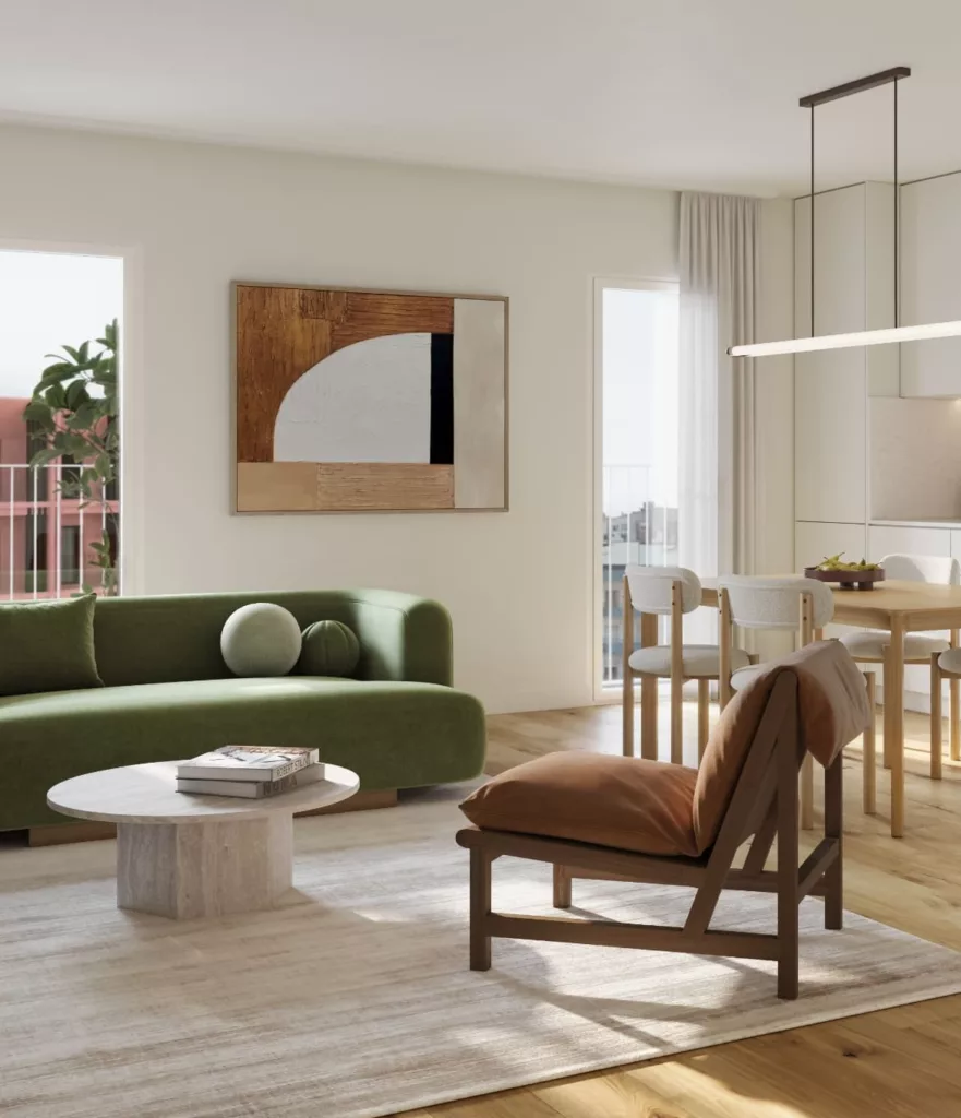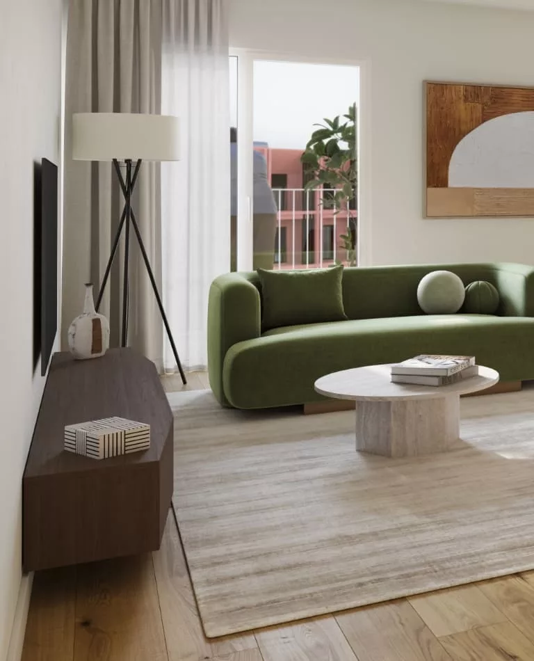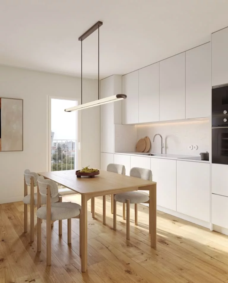 Projetados para otimizar cada espaço, os apartamentos T2 combinam na perfeição a modernidade da sua estética com o ambiente prático, acolhedor e luminoso.